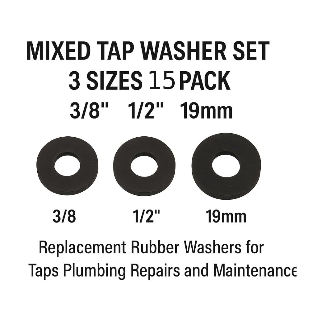 15 x Mixed Tap Washer Set – Rubber Replacement Washers 3/8", 1/2", 19mm – Sink, Basin & Bath Tap Leak Repair Kit