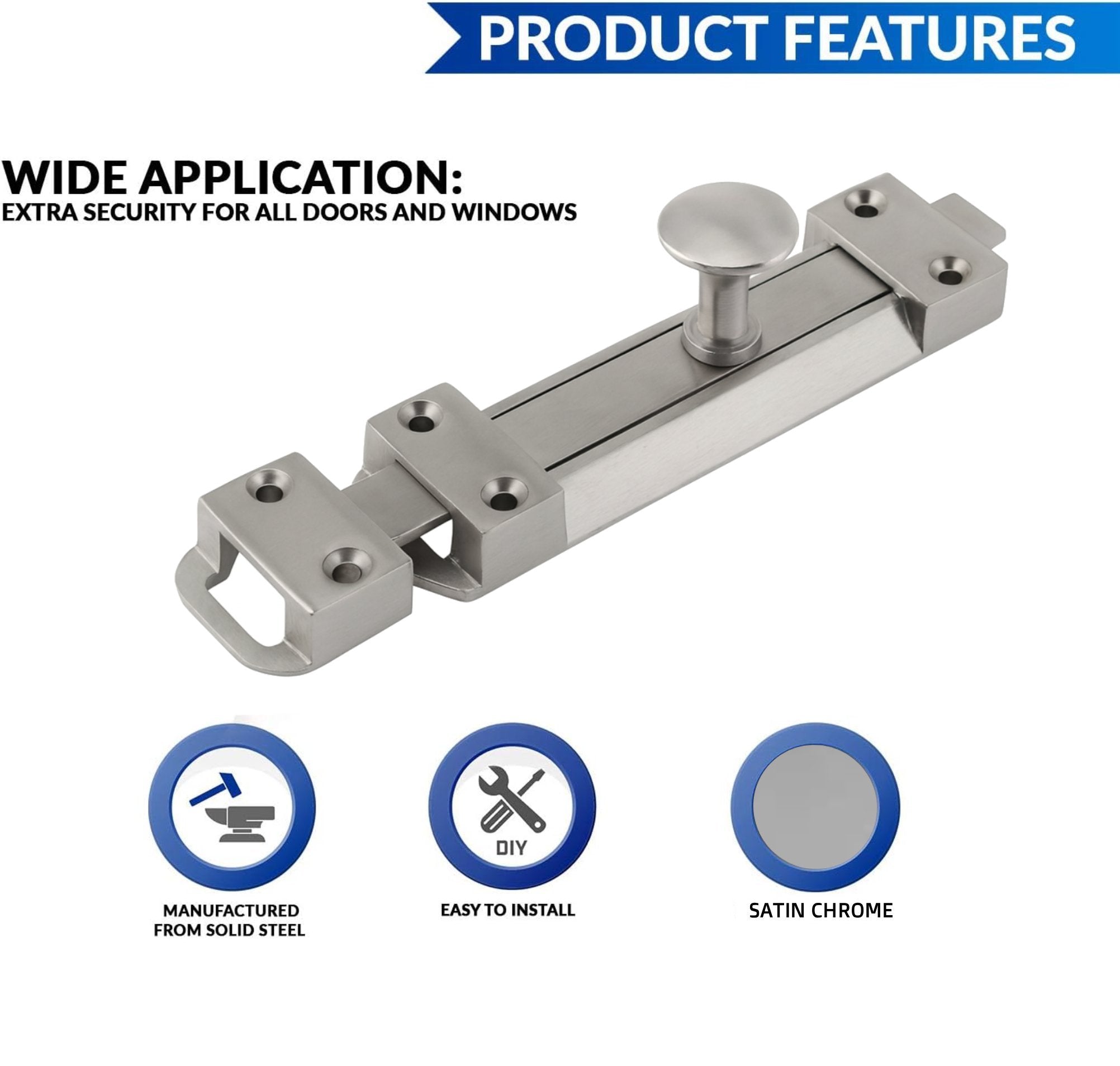 satin chrome door bolt, satin chrome tower bolt, satin chrome sliding door lock, 4 inch satin chrome bolt, 6 inch satin chrome bolt, 8 inch satin chrome bolt, satin chrome latch, bathroom satin chrome lock, cupboard satin chrome bolt