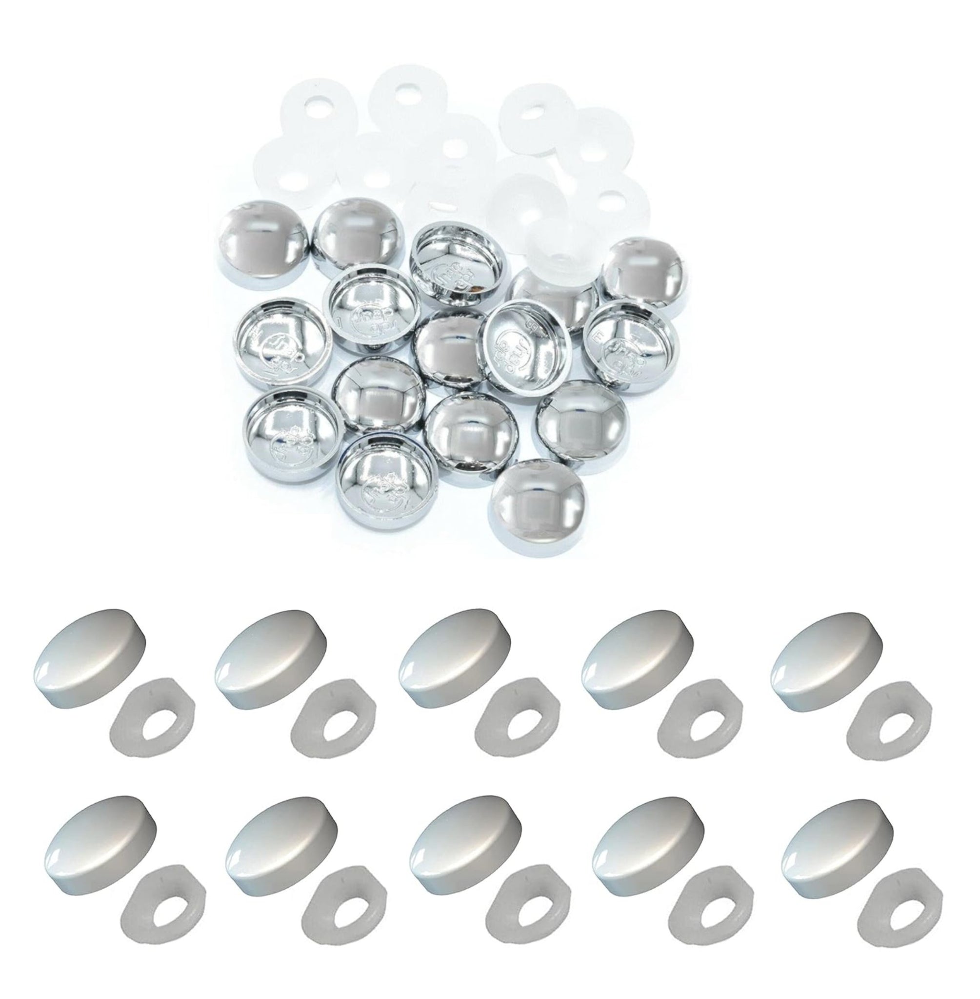 Each set includes metal base washers and matching screw covers that twist securely into place. Installation is simple – just screw through the base and snap or twist on the top for a polished, seamless appearance.