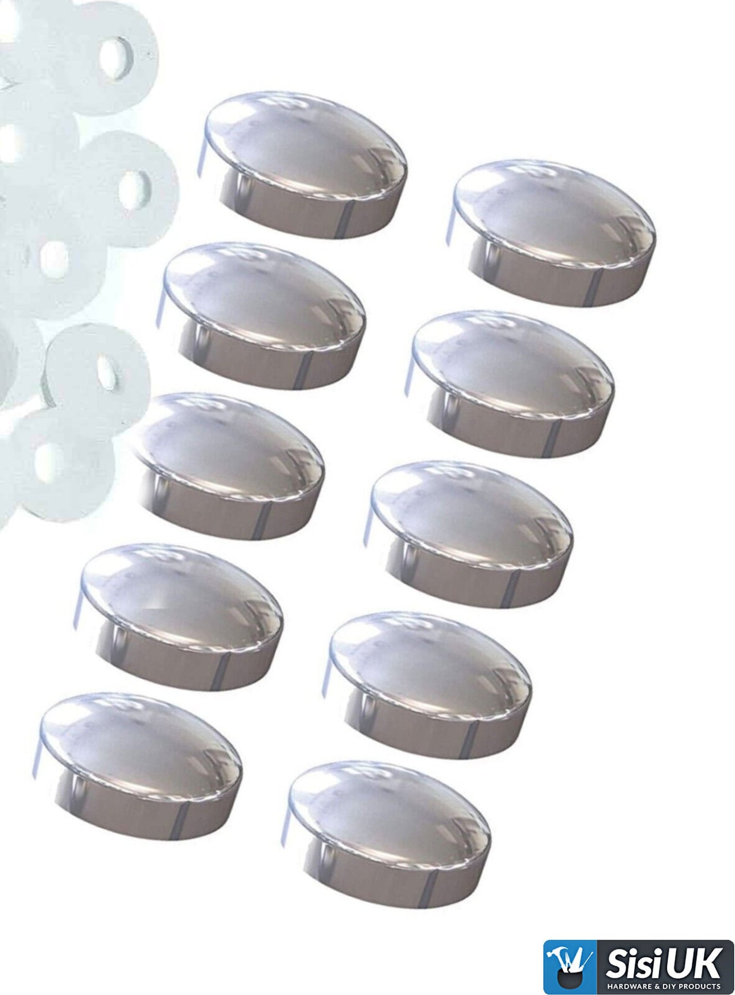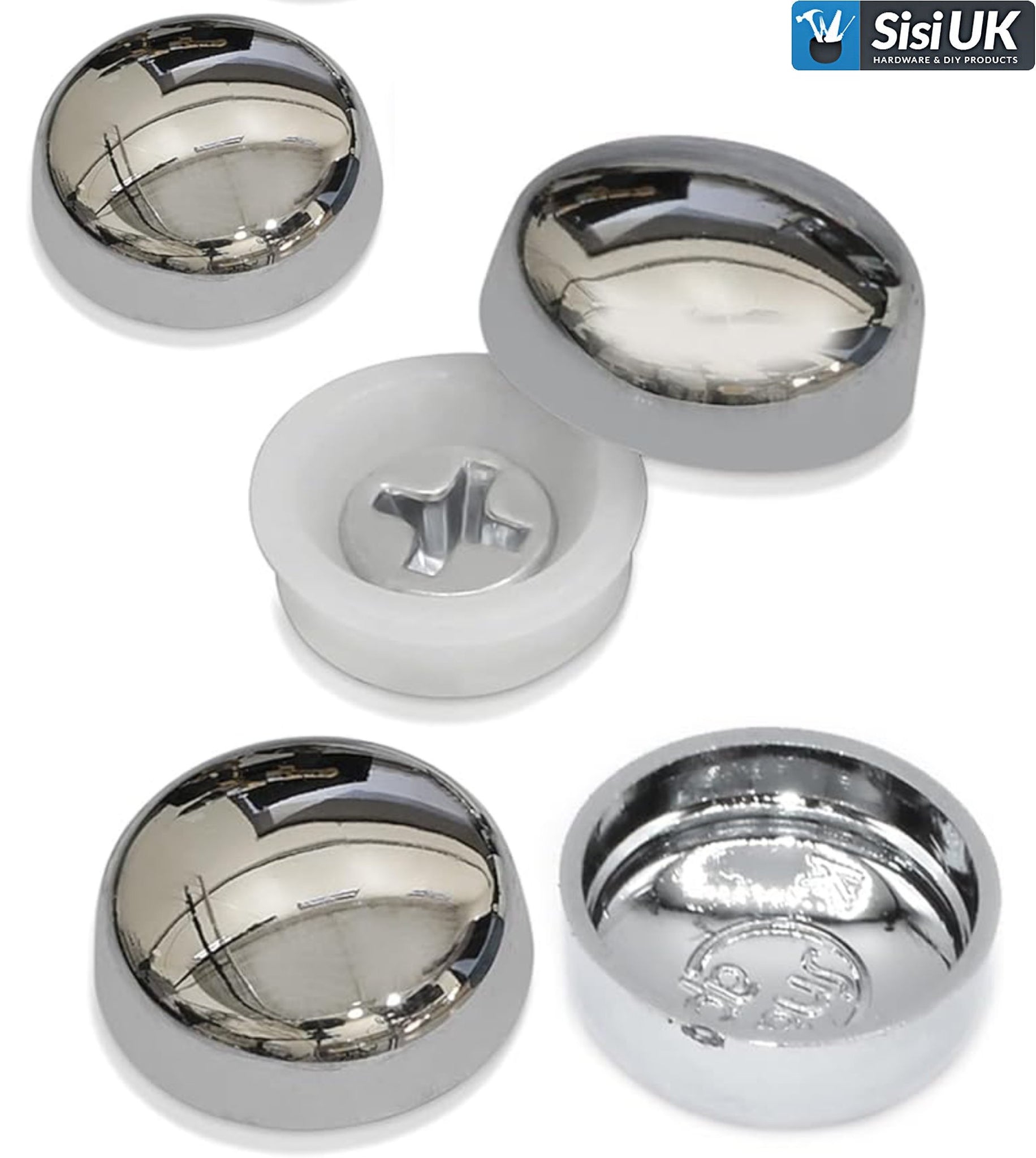 screw cover caps, chrome screw caps, white screw covers, mirror screw caps, metal screw covers, decorative screw caps, screw head covers, screw base washers, polished chrome screw cap set, furniture screw covers, mirror fixing caps, screw caps UK