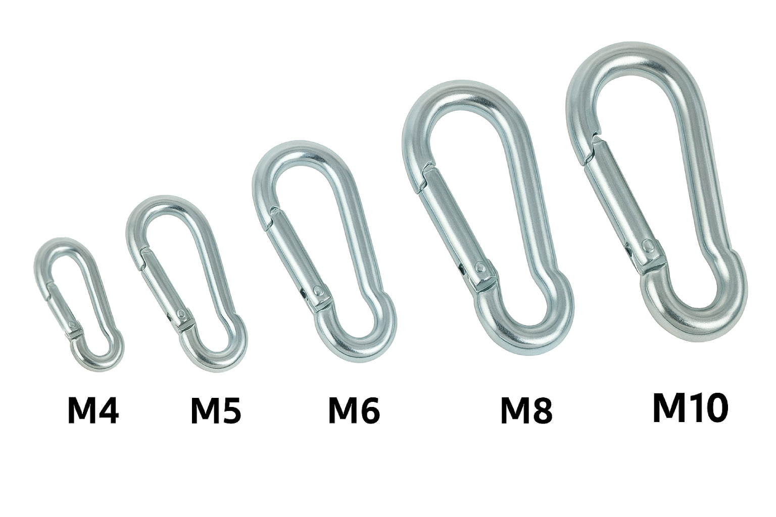 snap hooks zinc plated, zinc plated carabiner clip, M4 snap hook, M5 snap hook, M6 snap hook, M8 snap hook, M10 snap hook, steel snap hook, rope snap clip, zinc snap hook