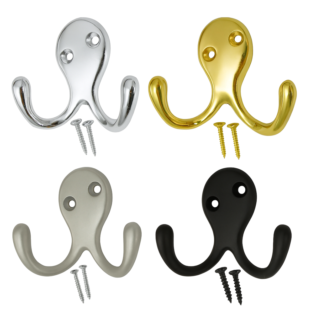 Twin Double Robe Coat Hooks – Chrome, Brass Plated & Matt Black – Heavy Duty Wall & Door Hooks for Bathroom, Bedroom & Clothes Storage
