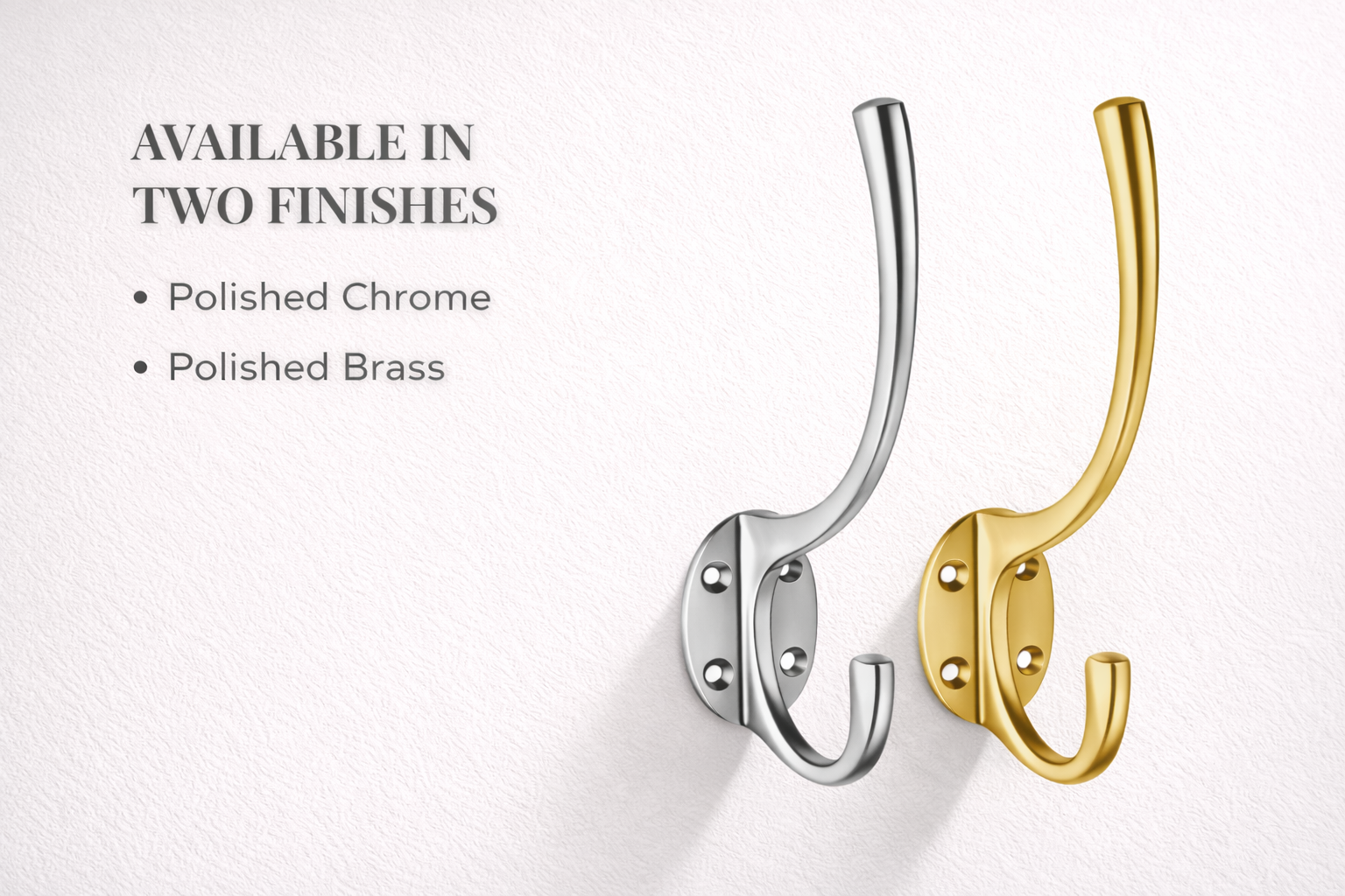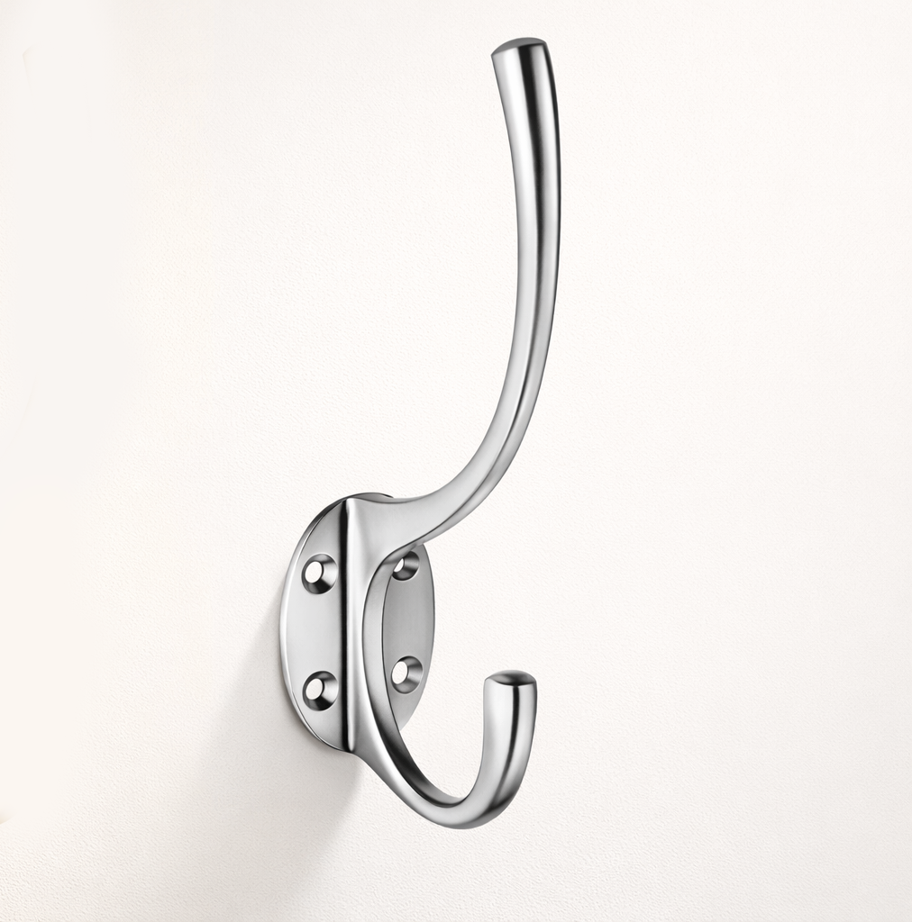 Available in Polished Brass and Polished Chrome, this hook blends seamlessly with traditional or modern door and cabinet hardware. The durable metal construction ensures reliable support for coats, hats, robes, towels and garments.