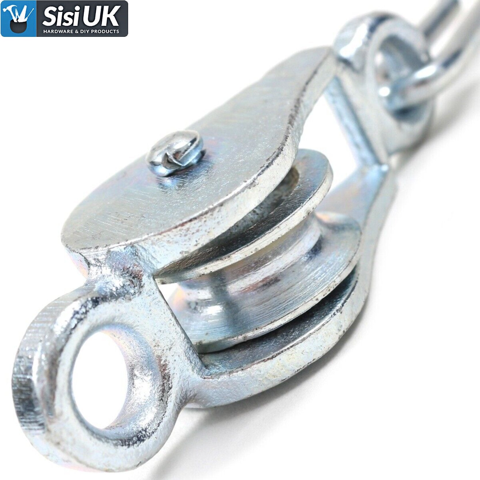 Manufactured from durable galvanised steel, the pulley is suitable for outdoor environments and resistant to corrosion. The hook-mounted design allows quick installation onto hooks, brackets or ceiling fixings.
