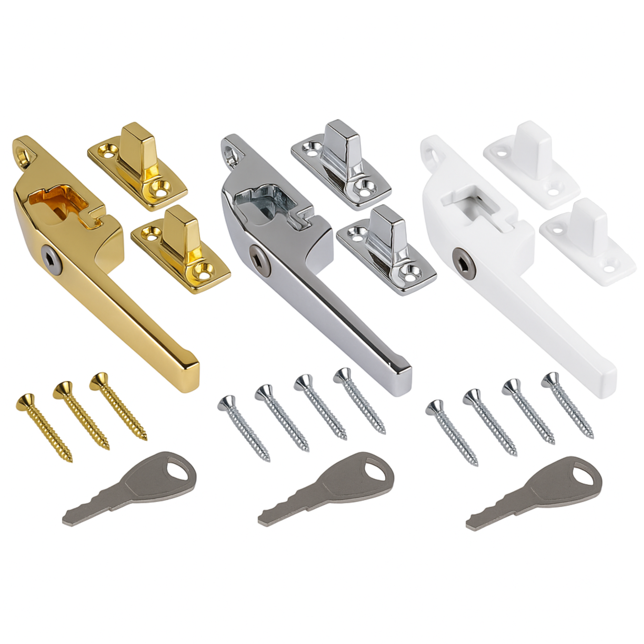 Available in Polished Brass for a traditional look, Polished Chrome for a sleek modern touch, and White for a clean, neutral style, these window fasteners combine practicality with aesthetic appeal.